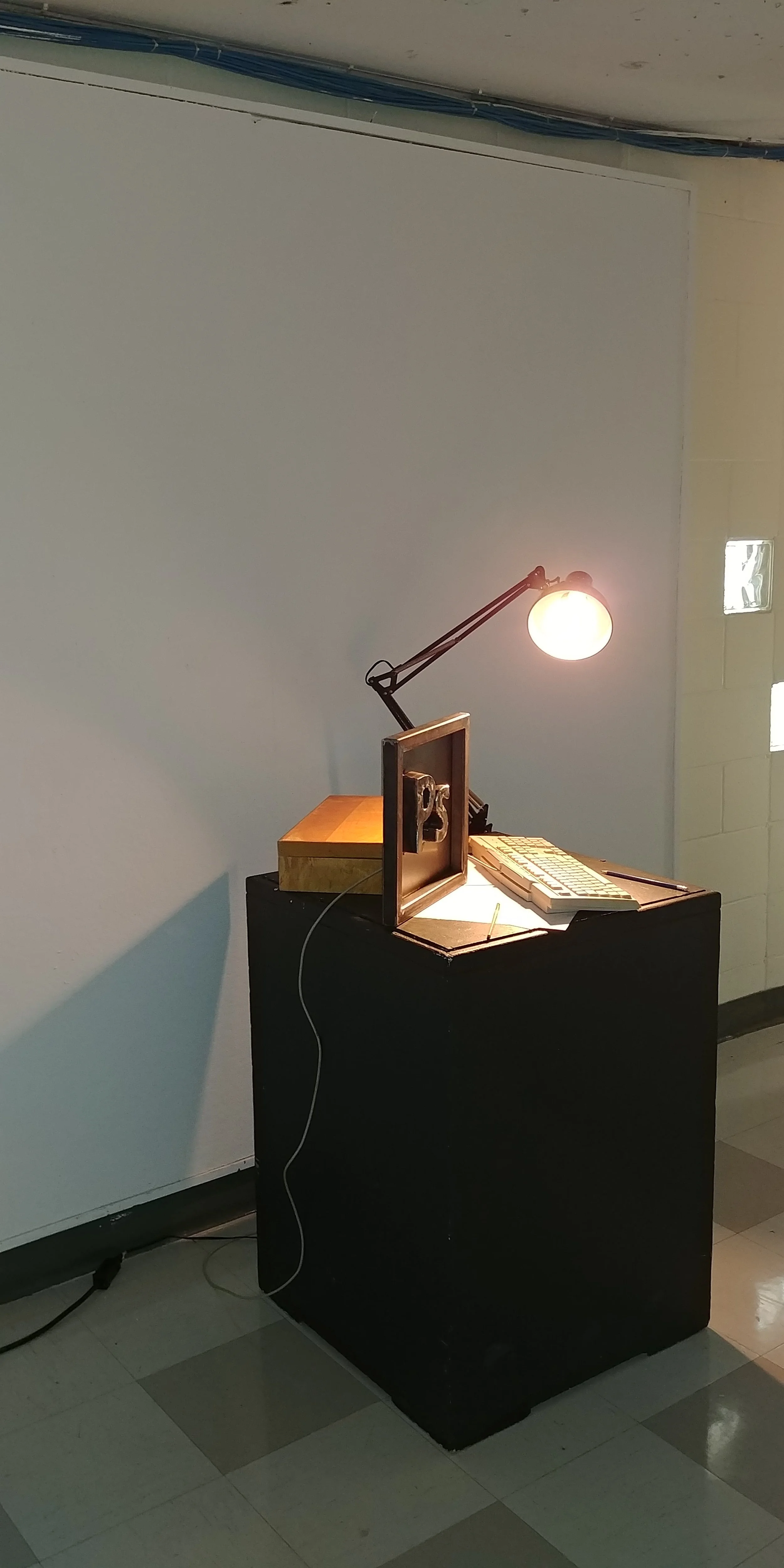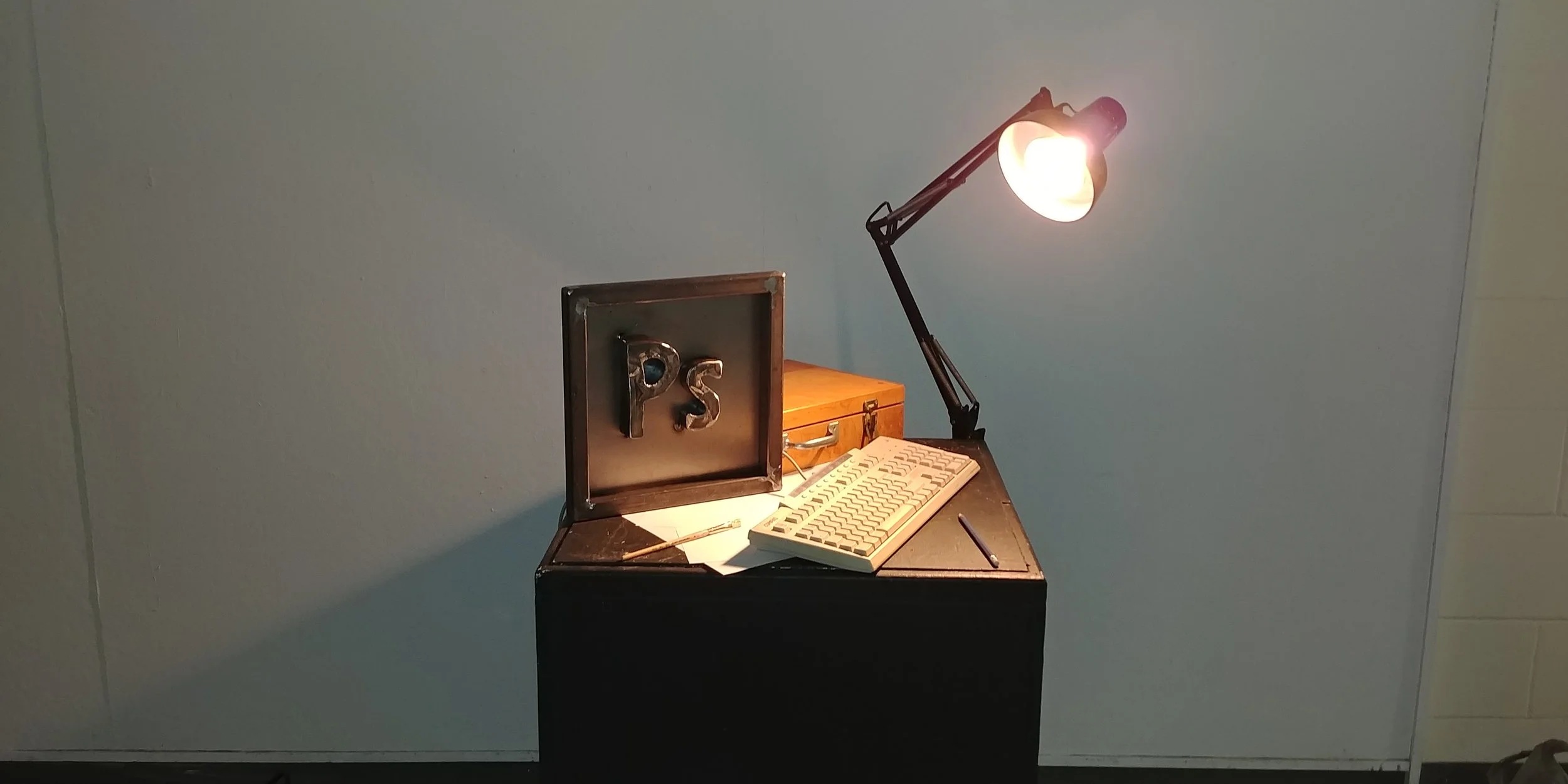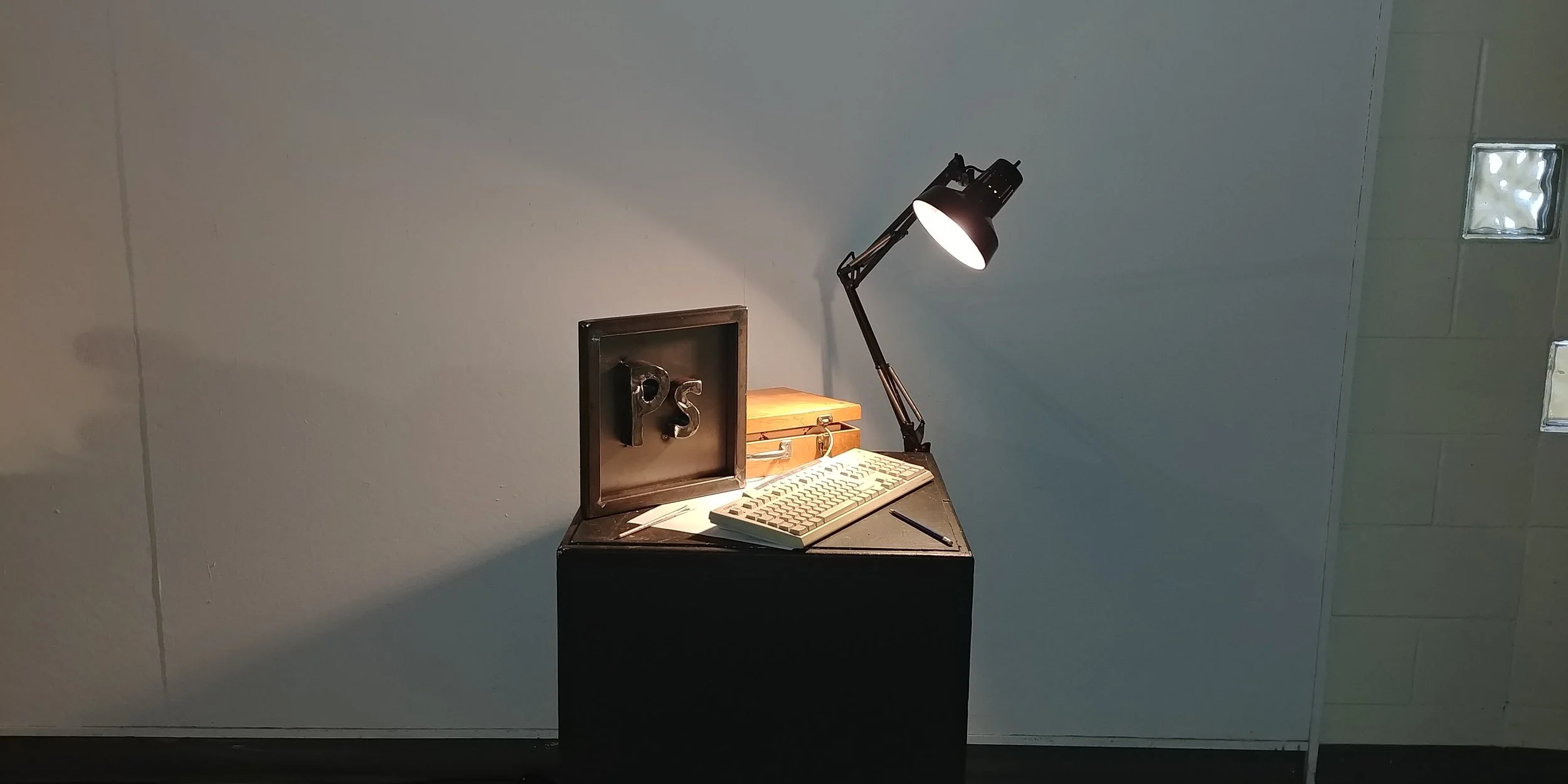 Logo de l’application Photoshop en métal soudé sur un socle accompagné de matériel d’artistes, d’un clavier et d’une lampe de bureau