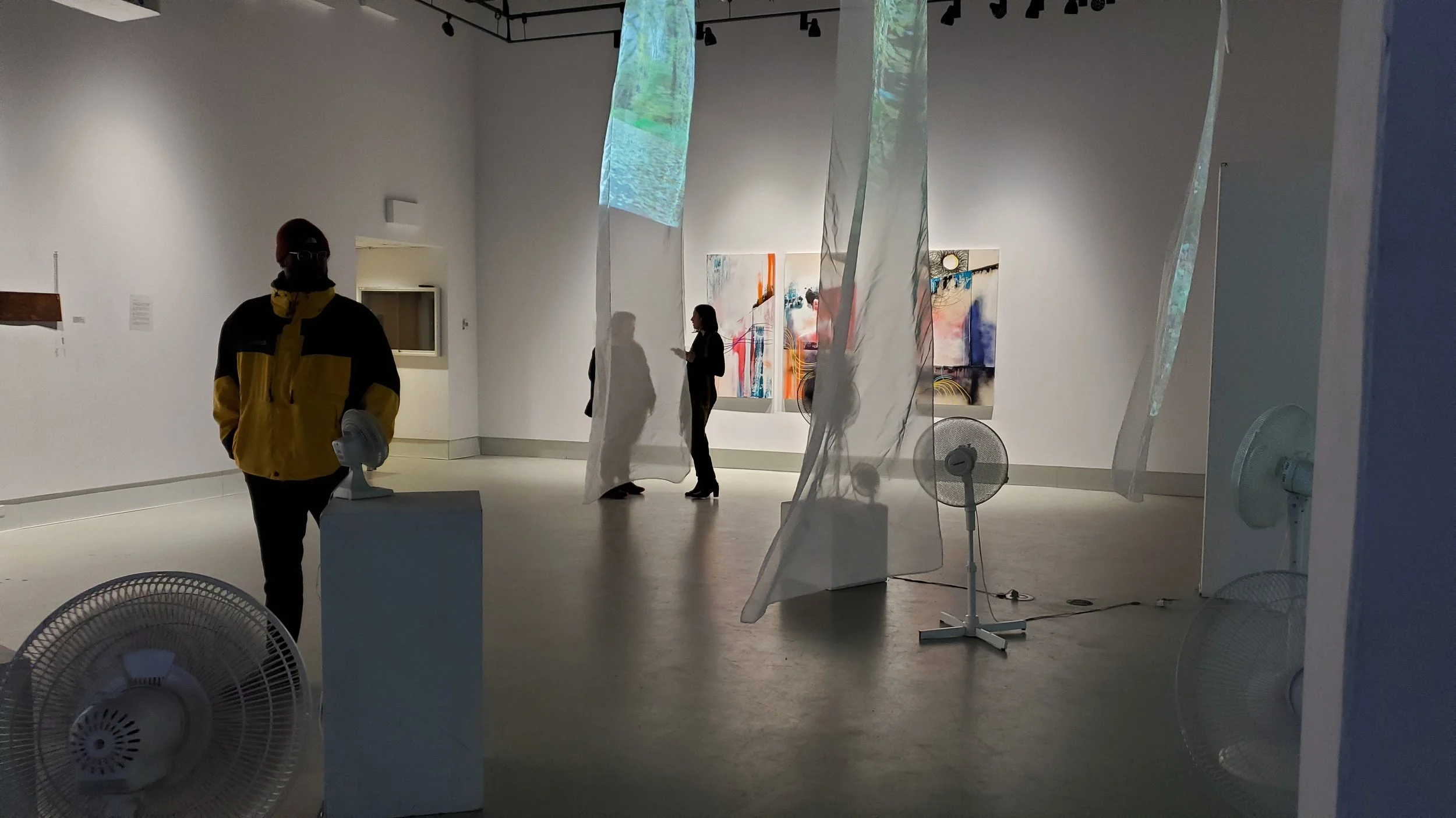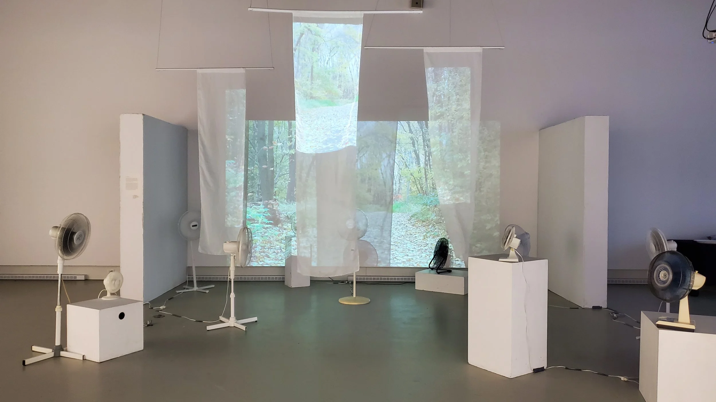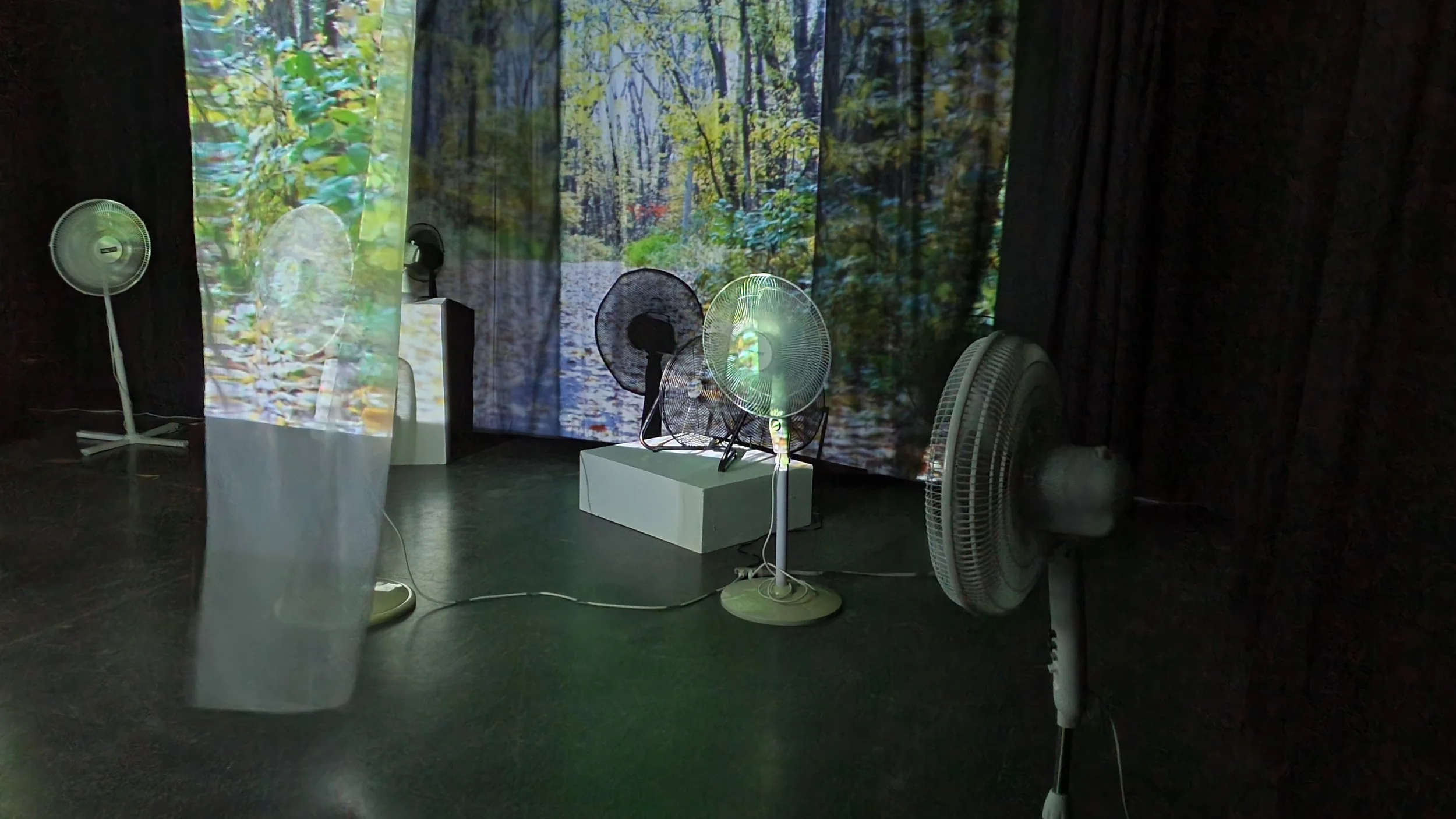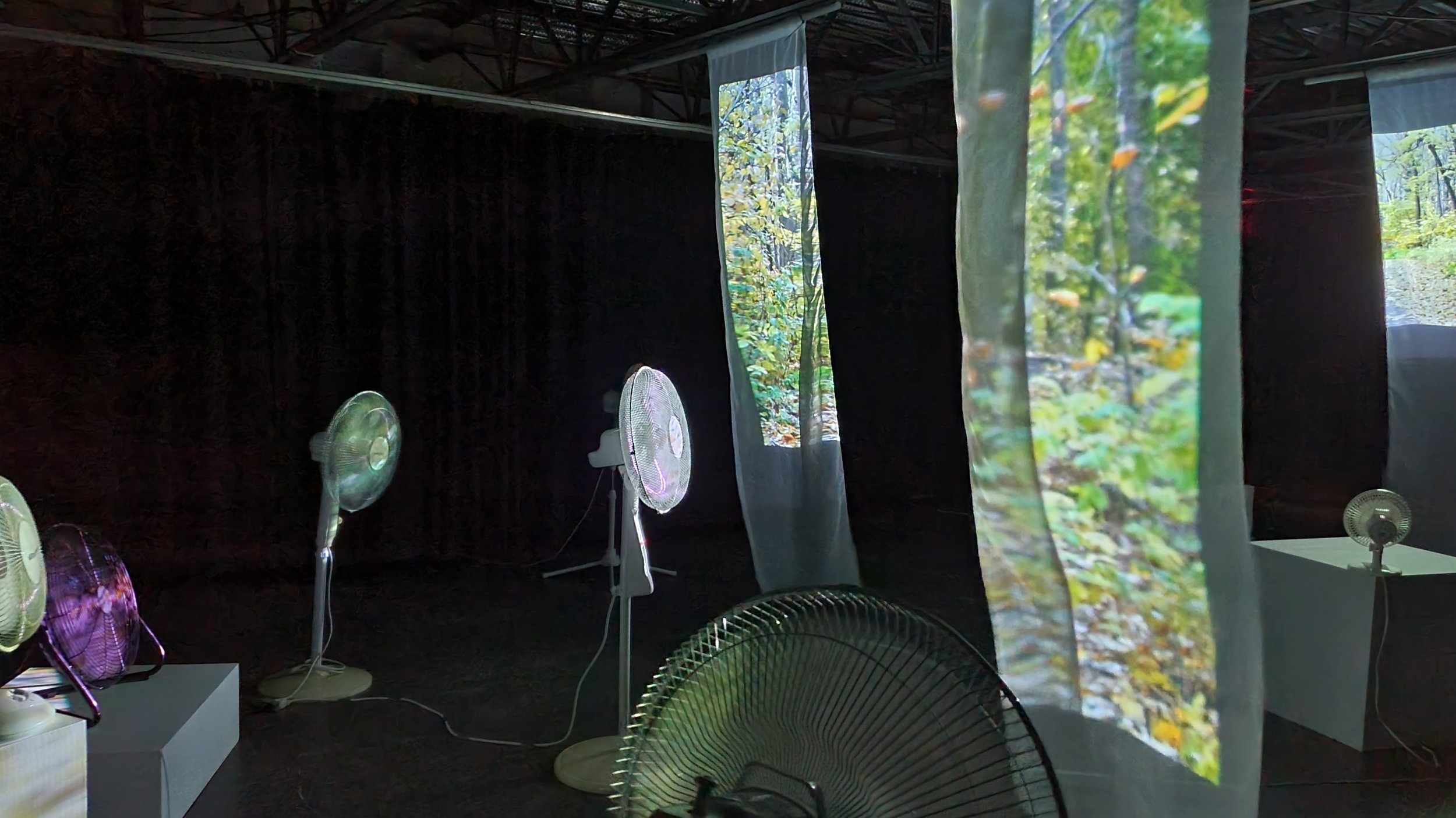 Le vent des ventilateurs affecte le support translucide soutenant l’image de bourrasques en pleine nature, mais il effleure aussi notre peau en même temps que nos yeux en perçoivent à différents plans.